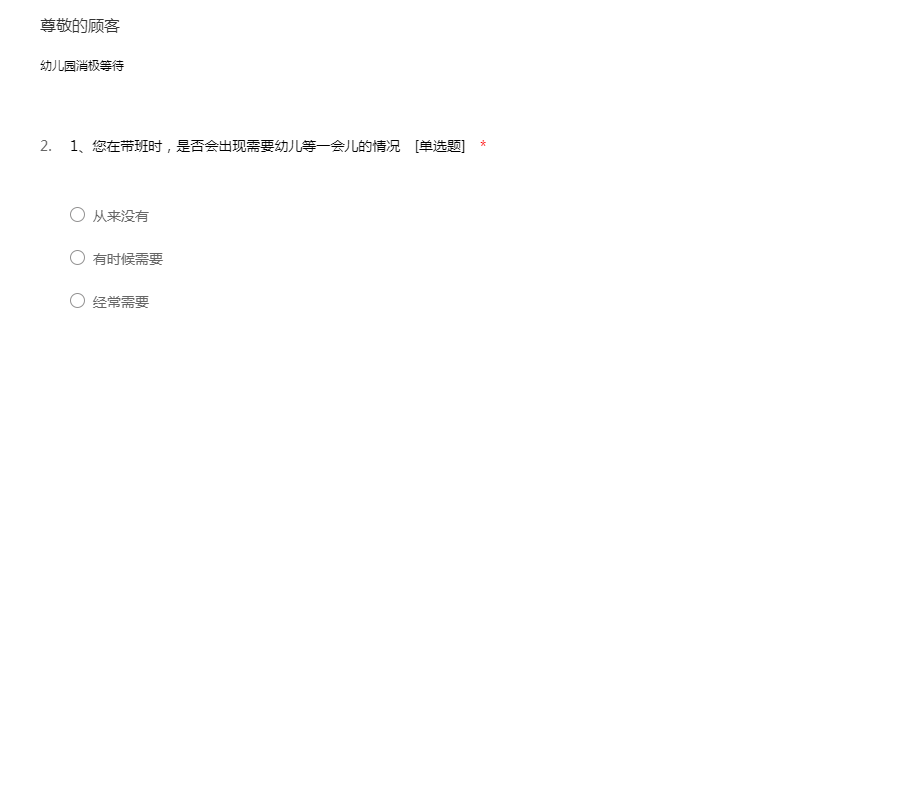 亲爱的老师: 您好! 感谢您能抽出宝贵的时间协助我们进行这次调查,在此对您表示衷心的感谢!作为幼儿园教师,您也许注意到在日常教育活动和生活活动中存在的幼儿等待现象。为了对等待现象做进一步的分析研究,本人特别设计了这份问卷,用来了解您对幼儿园中等待现象的真实态度和认识,希望您能认真作答。本问卷仅做科学研究之用,希望您能真实作答。谢谢您的合作!