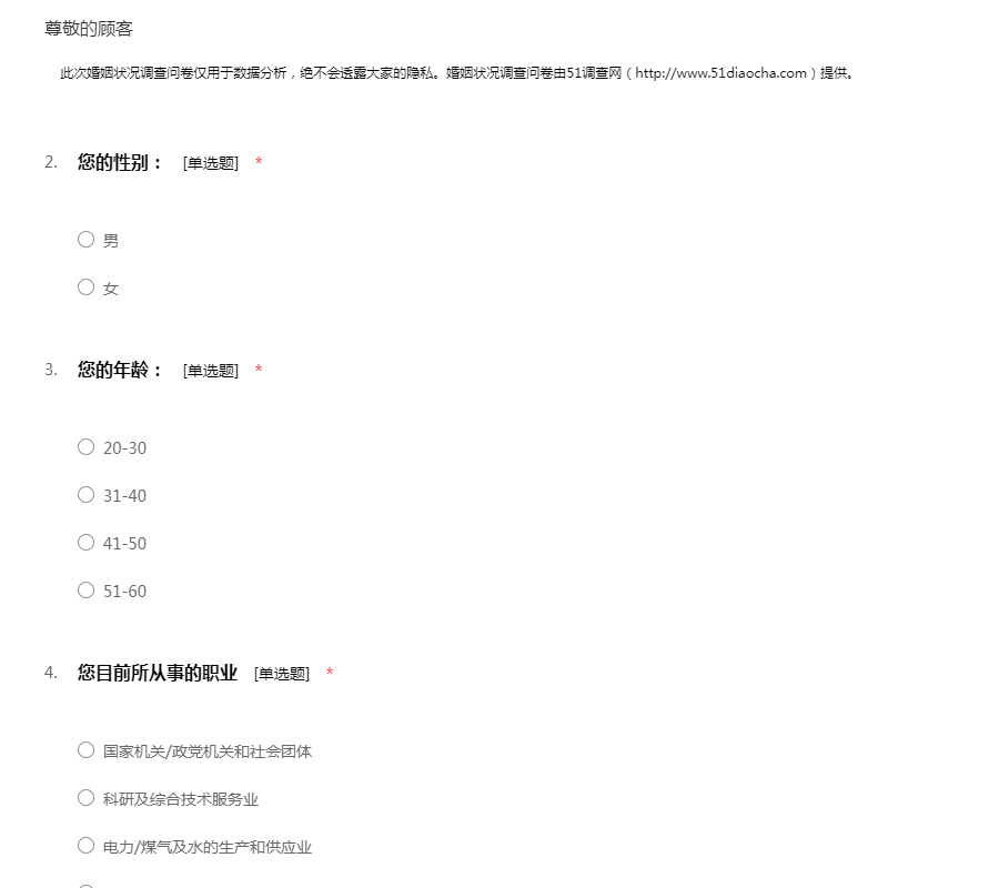此次婚姻状况调查问卷仅用于数据分析,绝不会透露大家的隐私。婚姻状况调查问卷由51调查网(http://www.51diaocha.com)提供。