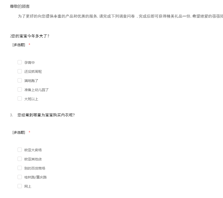 为了更好的向您提供丰富的产品和优质的服务,请完成下列调查问卷 ,完成后即可获得精美礼品一份,希望娃爱的蓓蓓陪伴您的宝宝共同成长!