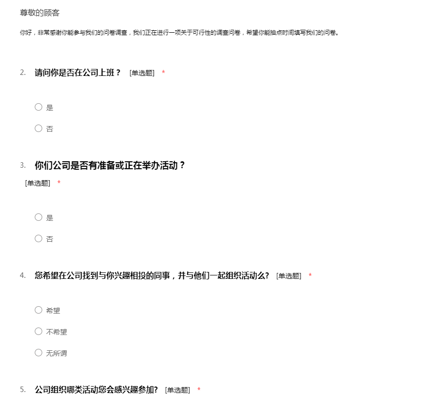 你好,非常感谢你能参与我们的问卷调查,我们正在进行一项关于可行性的调查问卷,希望你能抽点时间填写我们的问卷。