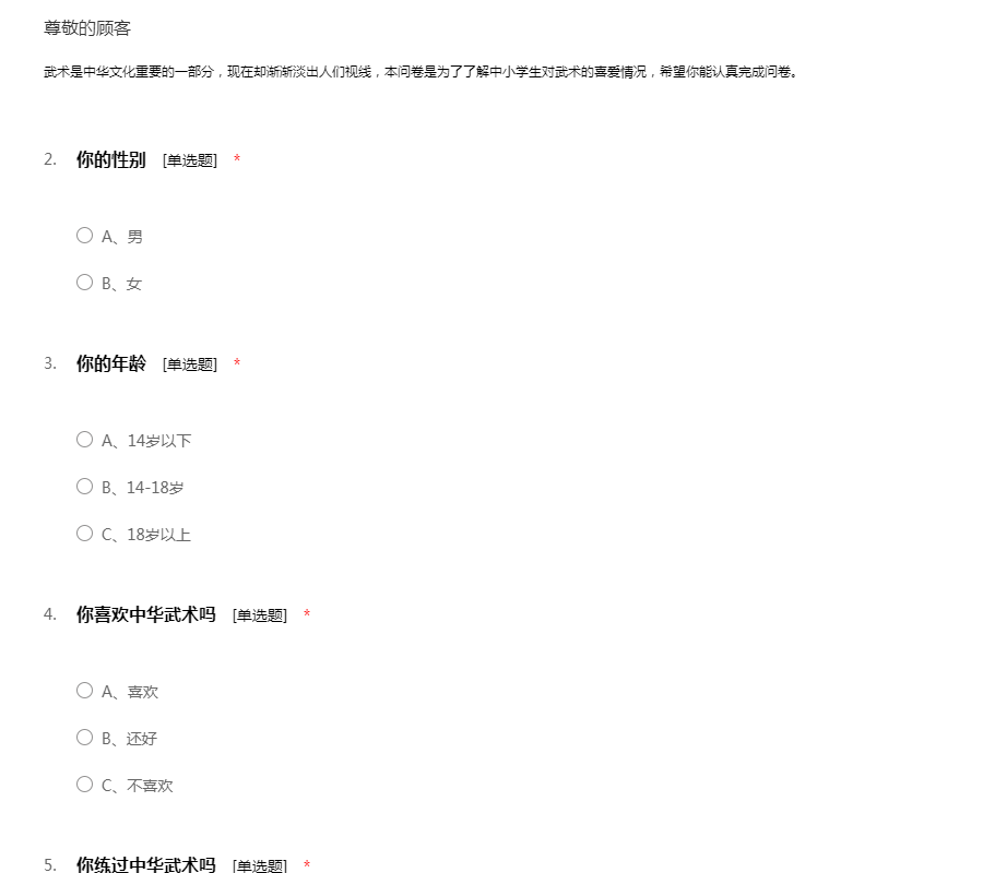 武术是中华文化重要的一部分,现在却渐渐淡出人们视线,本问卷是为了了解中小学生对武术的喜爱情况,希望你能认真完成问卷。