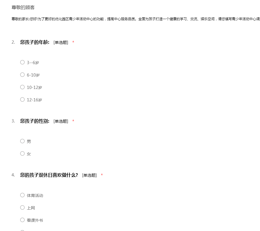 尊敬的家长:您好!为了更好的优化园区青少年活动中心的功能,提高中心服务品质。全面为孩子打造一个健康的学习、交流、娱乐空间,请您填写青少年活动中心调查问卷