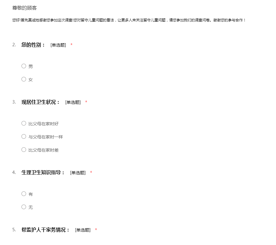 您好!首先真诚地感谢您参加这次调查!您对留守儿童问题的看法,让更多人来关注留守儿童问题,请您参加我们的调查问卷。谢谢您的参与合作!