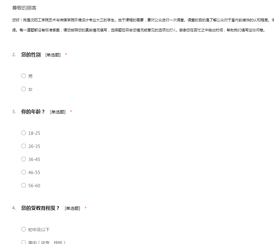 您好!我是沈阳工学院艺术与传媒学院环境设计专业大三的学生。由于课程的需要,要对公众进行一次调查。调查的目的是了解公众对于室内软装饰的认知程度。本次调查不署名,希望您在填写时不要有任何的顾虑。每一道题都没有标准答案,请您按照您的真实情况填写,选择题在符合您情况或意见的选项处打√。谢谢您在百忙之中抽出时间,帮助我们填写这份问卷。