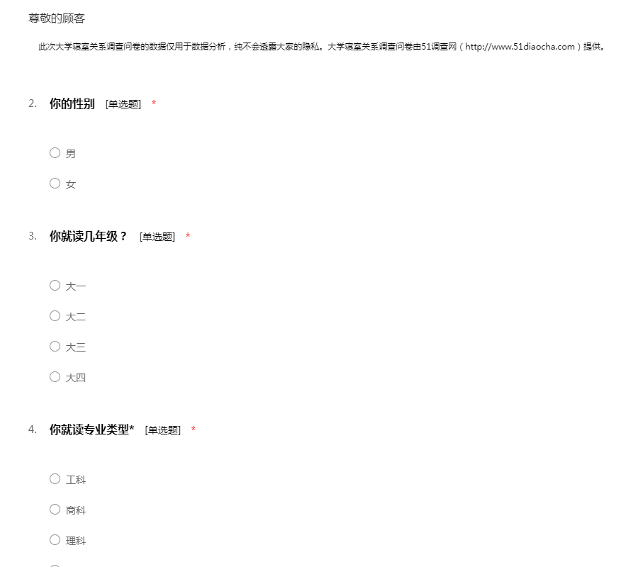 此次大学寝室关系调查问卷的数据仅用于数据分析,纯不会透露大家的隐私。大学寝室关系调查问卷由51调查网(http://www.51diaocha.com)提供。