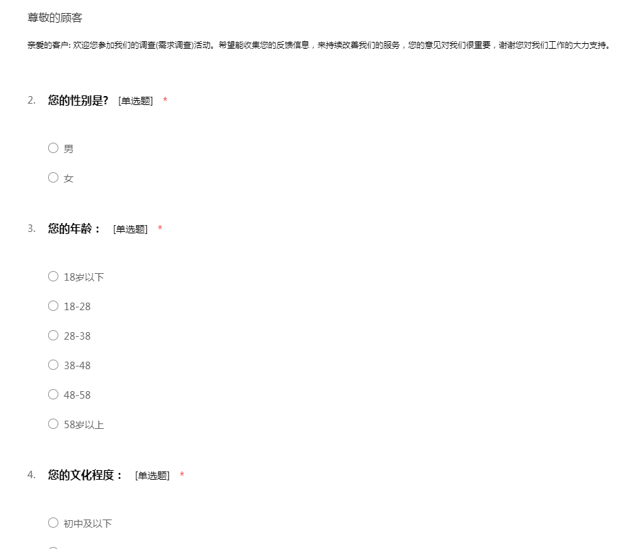 亲爱的客户: 欢迎您参加我们的调查(需求调查)活动。希望能收集您的反馈信息,来持续改善我们的服务,您的意见对我们很重要,谢谢您对我们工作的大力支持。