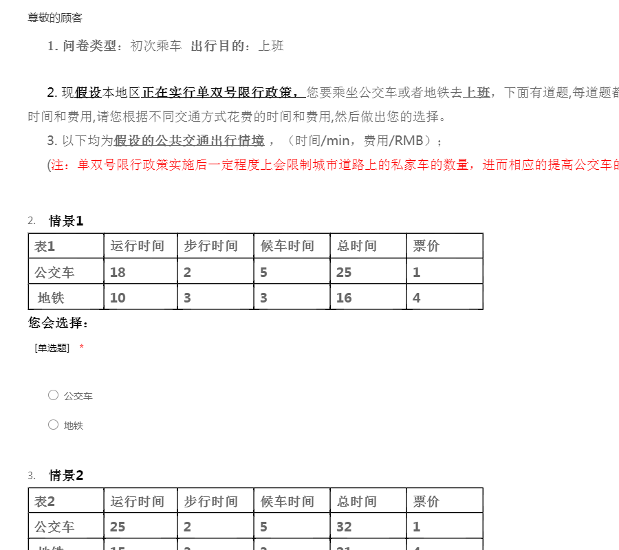 1.问卷类型:初次乘车 出行目的:上班 2. 现假设本地区正在实行单双号限行政策,您要乘坐公交车或者地铁去上班,下面有道题,每道题都列有公交车和地铁分别花费的时间和费用,请您根据不同交通方式花费的时间和费用,然后做出您的选择。 3. 以下均为假设的公共交通出行情境 ,(时间/min,费用/RMB); (注:单双号限行政策实施后一定程度上会限制城市道路上的私家车的数量,进而相应的提高公交车的出勤率、运行效率等等)