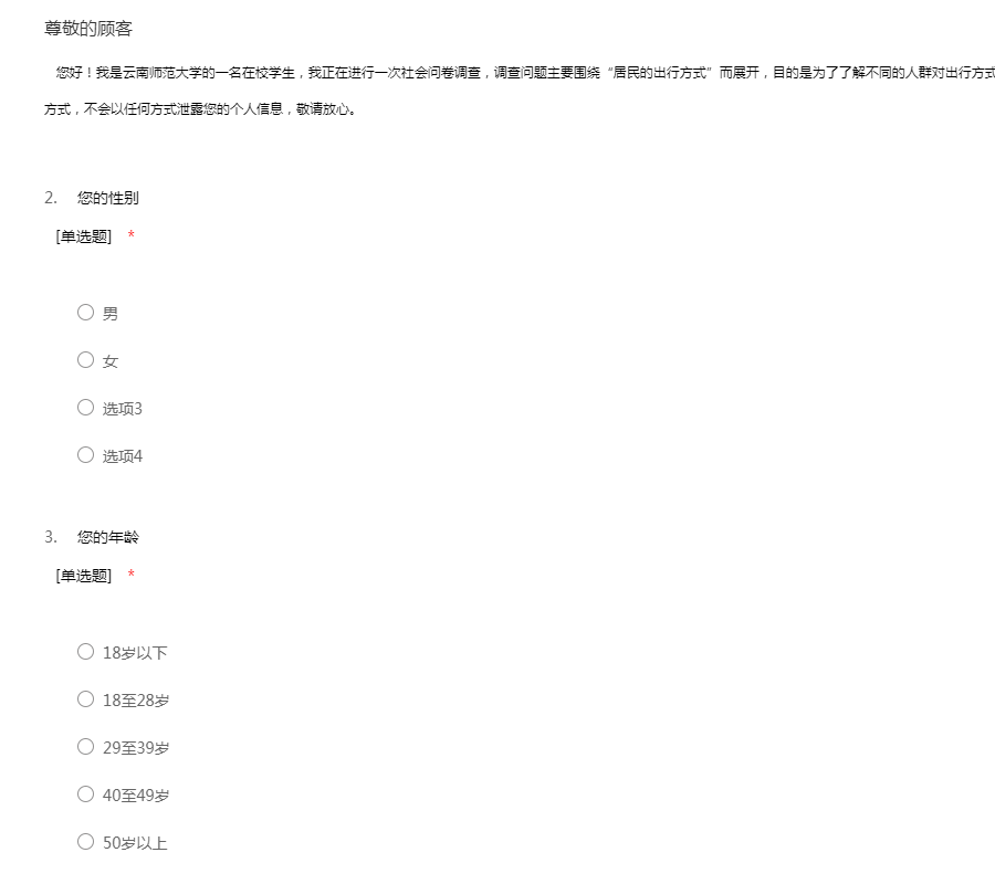 您好!我是云南师范大学的一名在校学生,我正在进行一次社会问卷调查,调查问题主要围绕“居民的出行方式”而展开,目的是为了了解不同的人群对出行方式的选择有什么不同,为什么不同。调查采取匿名方式,不会以任何方式泄露您的个人信息,敬请放心。