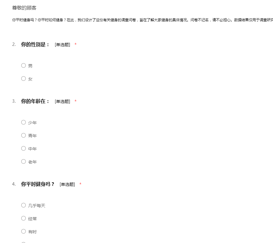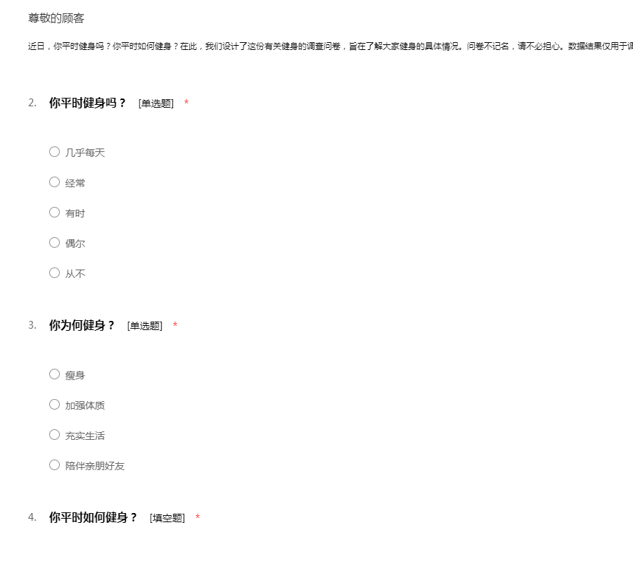 近日,你平时健身吗?你平时如何健身?在此,我们设计了这份有关健身的调查问卷,旨在了解大家健身的具体情况。问卷不记名,请不必担心。数据结果仅用于调查研究之用,感谢您的积极参与!