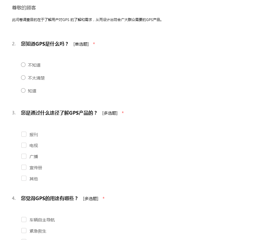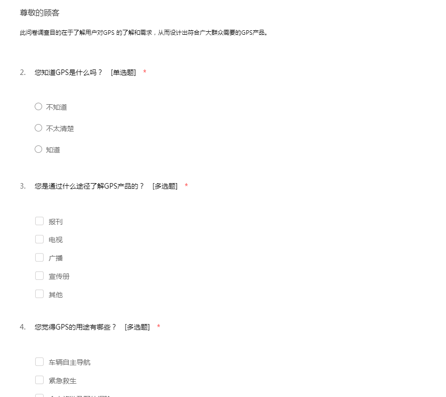 此问卷调查目的在于了解用户对GPS 的了解和需求,从而设计出符合广大群众需要的GPS产品。