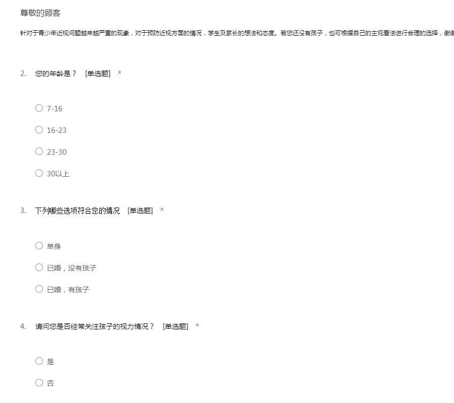 针对于青少年近视问题越来越严重的现象,对于预防近视方面的情况,学生及家长的想法和态度。若您还没有孩子,也可根据自己的主观看法进行合理的选择,谢谢您的配合!