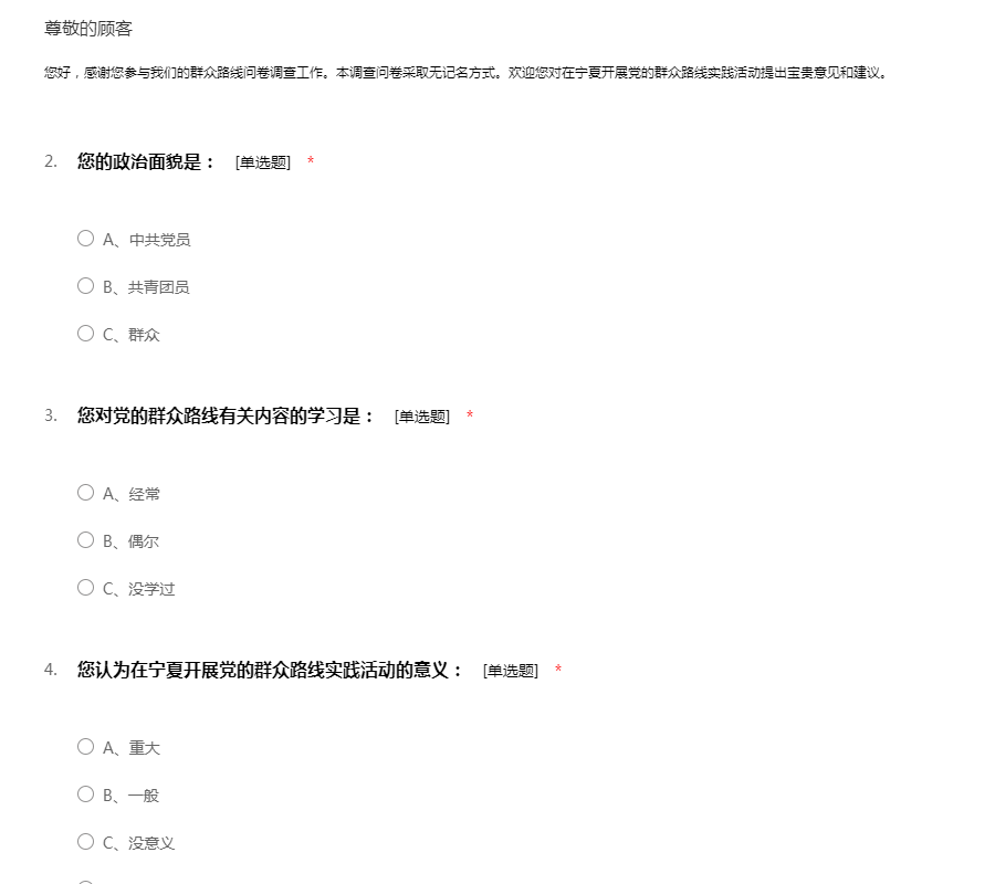 您好,感谢您参与我们的群众路线问卷调查工作。本调查问卷采取无记名方式。欢迎您对在宁夏开展党的群众路线实践活动提出宝贵意见和建议。