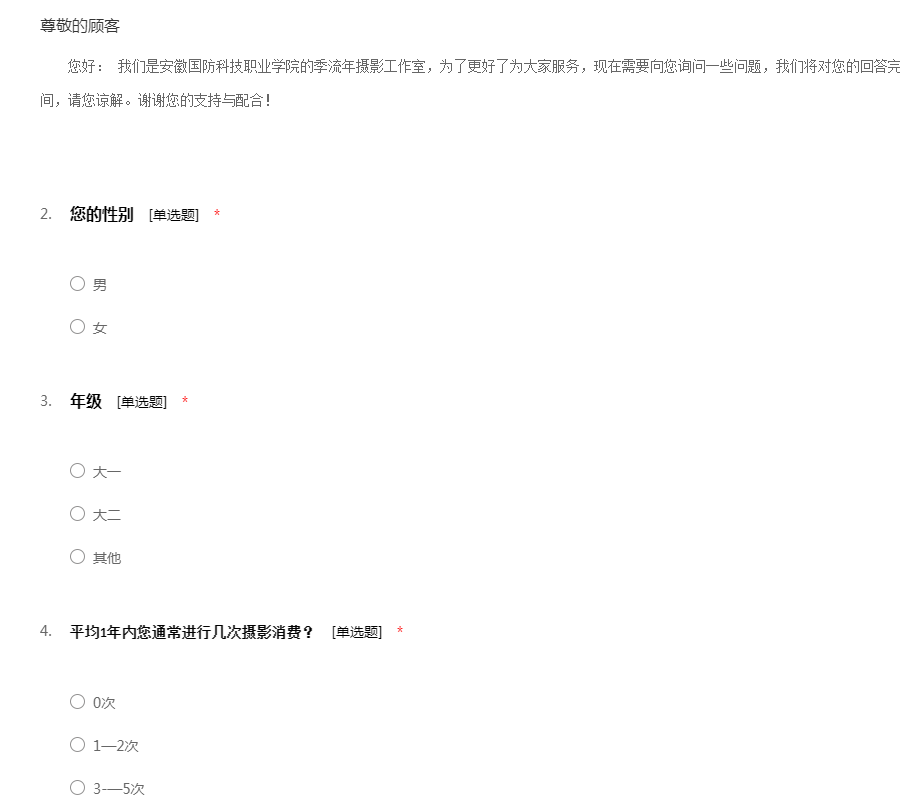 您好: 我们是安徽国防科技职业学院的季流年摄影工作室,为了更好了为大家服务,现在需要向您询问一些问题,我们将对您的回答完全保密。调查将会耽误您大概3分钟时间,请您谅解。谢谢您的支持与配合!