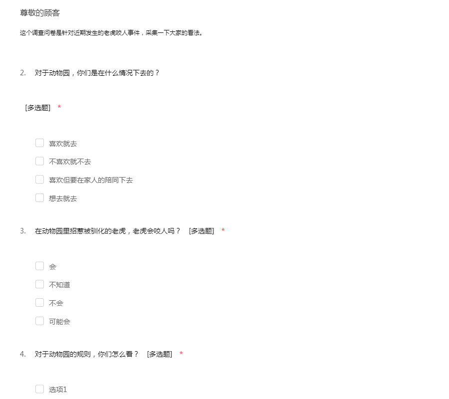 这个调查问卷是针对近期发生的老虎咬人事件,采集一下大家的看法。