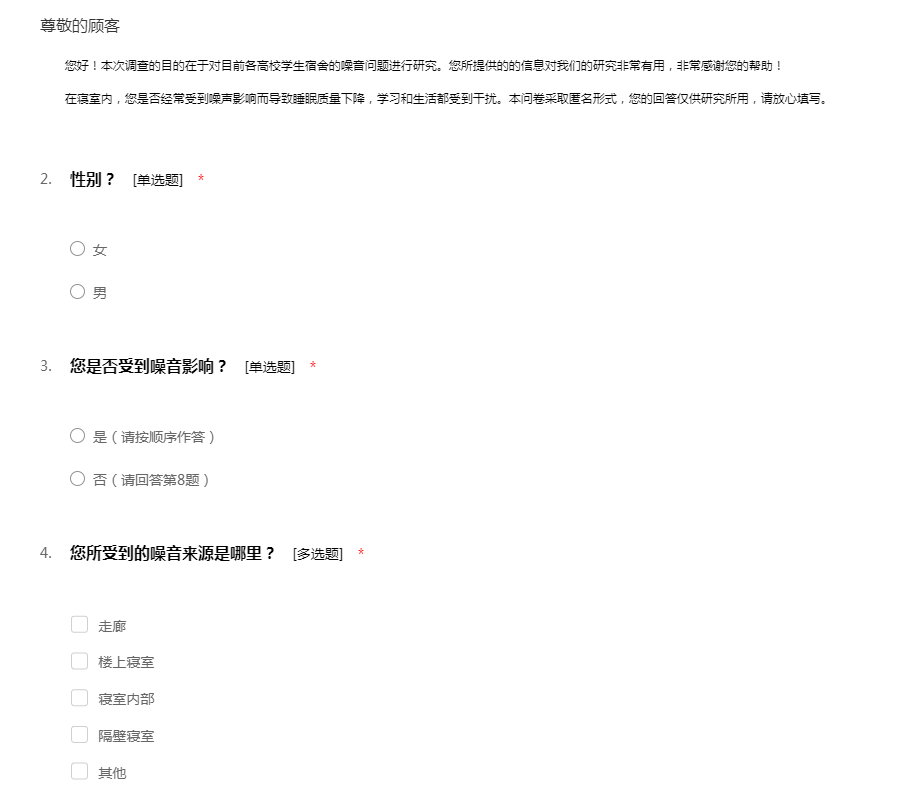 您好!本次调查的目的在于对目前各高校学生宿舍的噪音问题进行研究。您所提供的的信息对我们的研究非常有用,非常感谢您的帮助! 在寝室内,您是否经常受到噪声影响而导致睡眠质量下降,学习和生活都受到干扰。本问卷采取匿名形式,您的回答仅供研究所用,请放心填写。