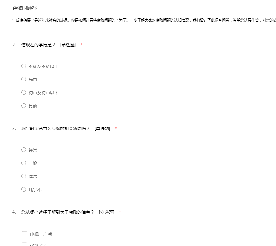 ”反腐倡廉“是近年来社会的热词。你是如何让看待腐败问题的?为了进一步了解大家对腐败问题的认知情况,我们设计了此调查问卷,希望您认真作答,对您的支持深表感谢!