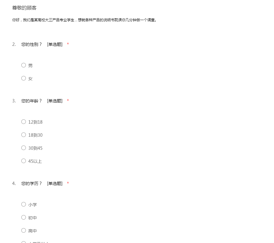 你好,我们是某高校大三产品专业学生,想就各种产品的说明书耽误你几分钟做一个调查。