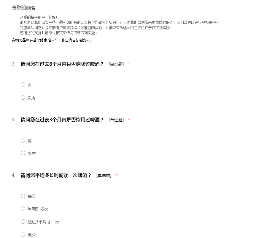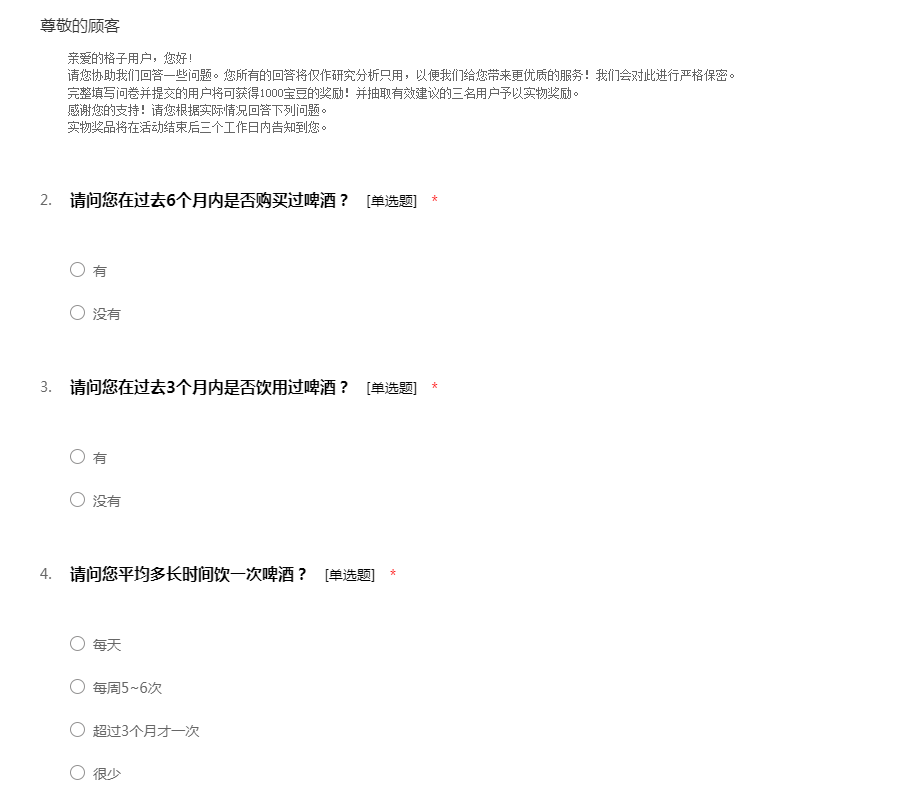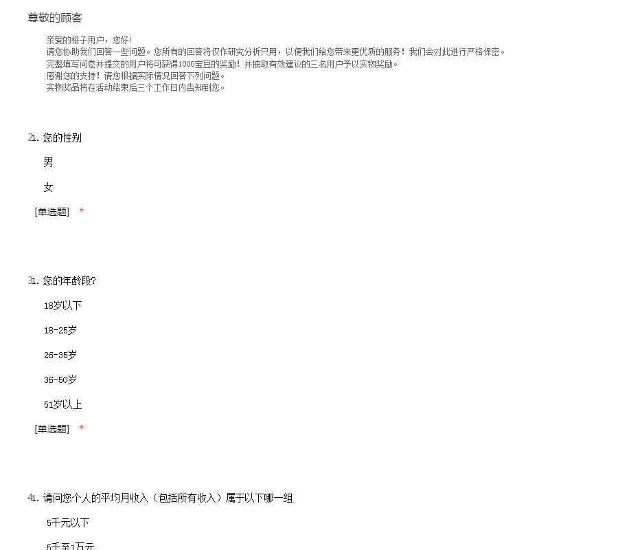 亲爱的格子用户,您好! 请您协助我们回答一些问题。您所有的回答将仅作研究分析只用,以便我们给您带来更优质的服务!我们会对此进行严格保密。 完整填写问卷并提交的用户将可获得1000宝豆的奖励!并抽取有效建议的三名用户予以实物奖励。 感谢您的支持!请您根据实际情况回答下列问题。 实物奖品将在活动结束后三个工作日内告知到您。。