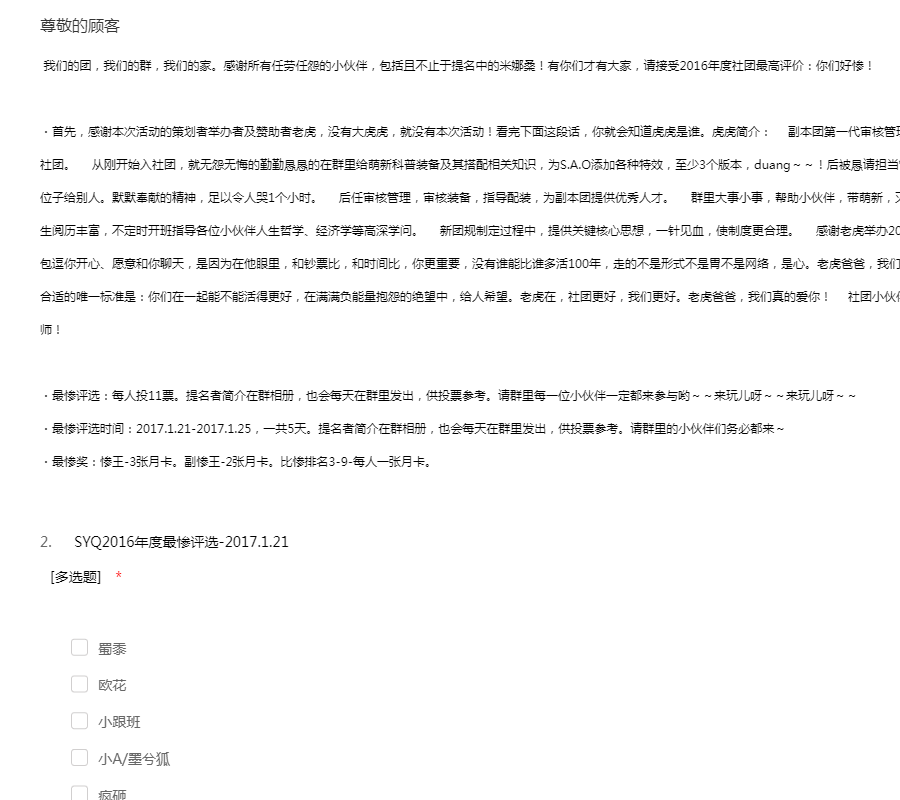 我们的团,我们的群,我们的家。感谢所有任劳任怨的小伙伴,包括且不止于提名中的米娜桑!有你们才有大家,请接受2016年度社团最高评价:你们好惨!・首先,感谢本次活动的策划者举办者及赞助者老虎,没有大虎虎,就没有本次活动!看完下面这段话,你就会知道虎虎是谁。虎虎简介:副本团第一代审核管理。超级辛苦。2016年6月,至今,一直照顾社团。从刚开始入社团,就无怨无悔的勤勤恳恳的在群里给萌新科普装备及其搭配相关知识,为S.A.O添加各种特效,至少3个版本,duang~~!后被恳请担当管理,其曰:该做的我全做,不求名不求利管理位子给别人。默默奉献的精神,足以令人哭1个小时。后任审核管理,审核装备,指导配装,为副本团提供优秀人才。群里大事小事,帮助小伙伴,带萌新,灭科技,无处不在。对待冲突合理分析指导,人生阅历丰富,不定时开班指导各位小伙伴人生哲学、经济学等高深学问。新团规制定过程中,提供关键核心思想,一针见血,使制度更合理。感谢老虎举办2016年度比惨大赛。朋友愿意请你吃饭、愿意发红包逗你开心、愿意和你聊天,是因为在他眼里,和钞票比,和时间比,你更重要,没有谁能比谁多活100年,走的不是形式不是胃不是网络,是心。老虎爸爸,我们爱你!有人说,判断朋友,甚至是伴侣,是否合适的唯一标准是:你们在一起能不能活得更好,在满满负能量抱怨的绝望中,给人希望。老虎在,社团更好,我们更好。老虎爸爸,我们真的爱你!社团小伙伴一致赞同的一句话总结:老虎大大,人生导师!・最惨评选:每人投11票。提名者简介在群相册,也会每天在群里发出,供投票参考。请群里每一位小伙伴一定都来参与哟~~来玩儿呀~~来玩儿呀~~ ・最惨评选时间:2017.1.21-2017.1.25,一共5天。提名者简介在群相册,也会每天在群里发出,供投票参考。请群里的小伙伴们务必都来~・最惨奖:惨王-3张月卡。副惨王-2张月卡。比惨排名3-9-每人一张月卡。