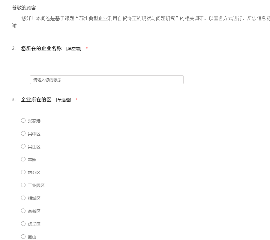 您好!本问卷是基于课题“苏州典型企业利用自贸协定的现状与问题研究”的相关调研。以匿名方式进行,所涉信息将严格保密,请您放心据实填写。谢谢!