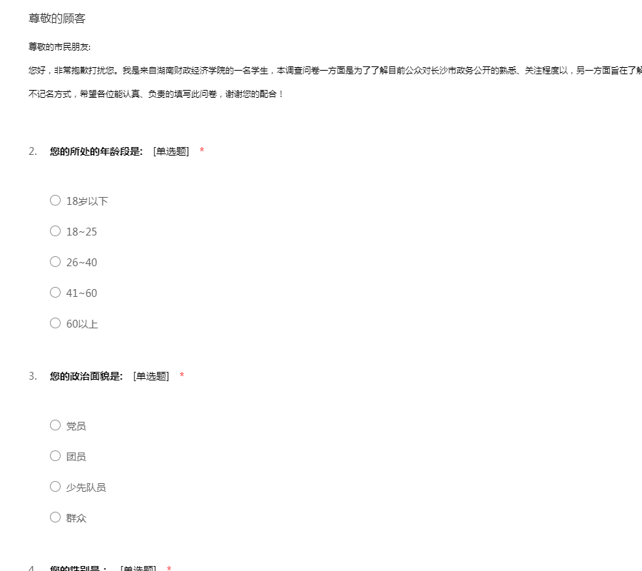 尊敬的市民朋友:您好,非常抱歉打扰您。我是来自湖南财政经济学院的一名学生,本调查问卷一方面是为了了解目前公众对长沙市政务公开的熟悉、关注程度以,另一方面旨在了解您对目前长沙市政务公开的意见。本次问卷采用不记名方式,希望各位能认真、负责的填写此问卷,谢谢您的配合!
