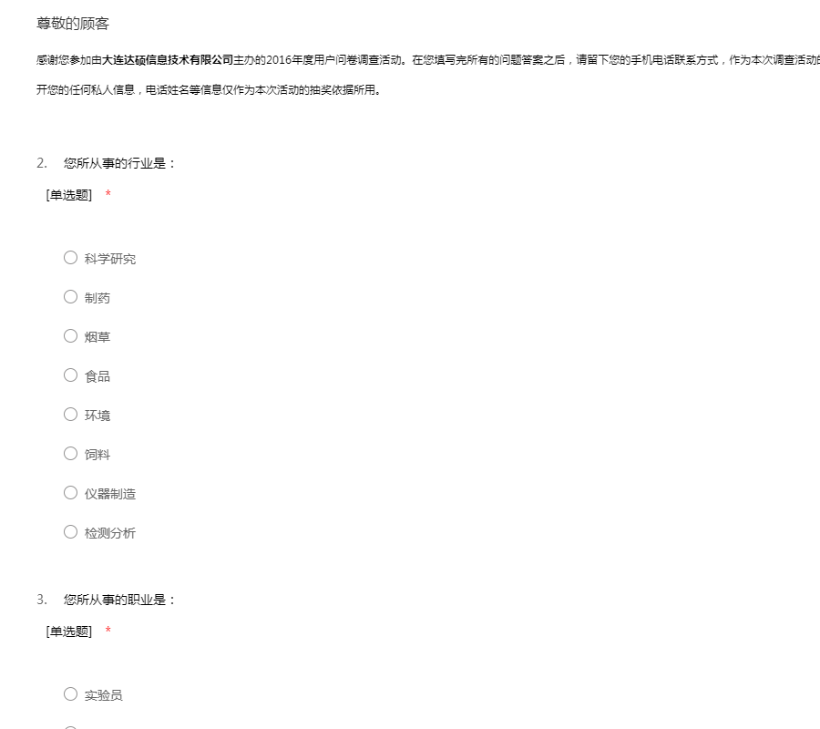 感谢您参加由大连达硕信息技术有限公司主办的2016年度用户问卷调查活动。在您填写完所有的问题答案之后,请留下您的手机电话联系方式,作为本次调查活动的抽奖依据。本着保密性原则,我们不会对外公开您的任何私人信息,电话姓名等信息仅作为本次活动的抽奖依据所用。