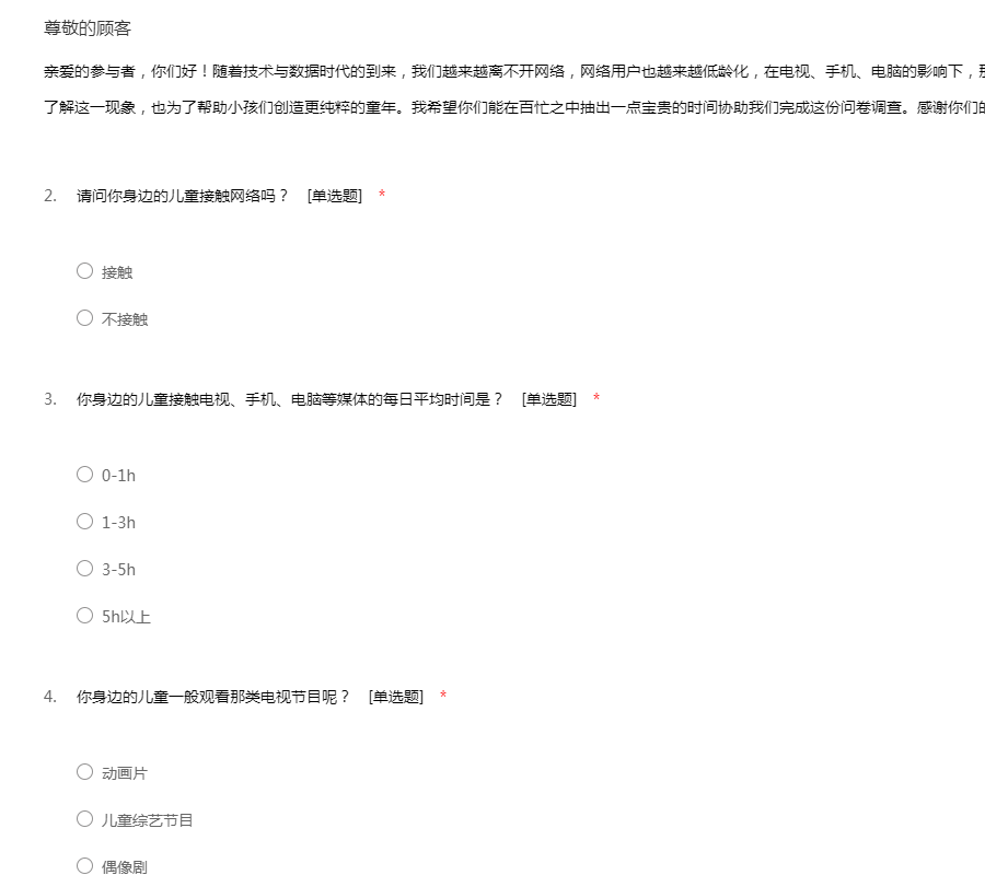 亲爱的参与者,你们好!随着技术与数据时代的到来,我们越来越离不开网络,网络用户也越来越低龄化,在电视、手机、电脑的影响下,那些孩子们的童年消逝了吗?为了更好的了解这一现象,也为了帮助小孩们创造更纯粹的童年。我希望你们能在百忙之中抽出一点宝贵的时间协助我们完成这份问卷调查。感谢你们的合作!