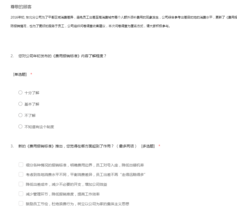 2016年初, 东北分公司为了平衡区域消费差异,避免员工出差至高消费城市需个人额外添补费用的现象发生,公司综合参考出差目的地的消费水平,更新了《费用报销标准》,截止日前已运行半年。为了更贴近实际报销情况,也为了更好的服务于员工,公司组织问卷调查收集建议,本次问卷调查为匿名方式,请大家积极参与。