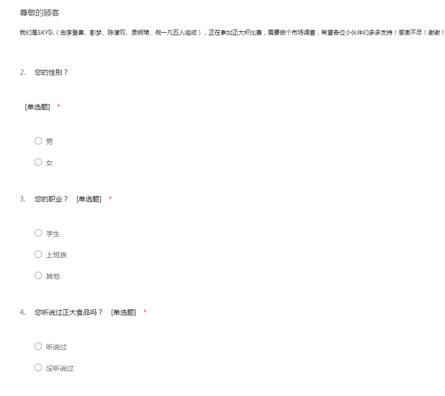 我们是SKY队(由李登喜、彭梦、陈潜双、录明琦、倪一凡五人组成),正在参加正大杯比赛,需要做个市场调查,希望各位小伙伴们多多支持!感激不尽!谢谢!