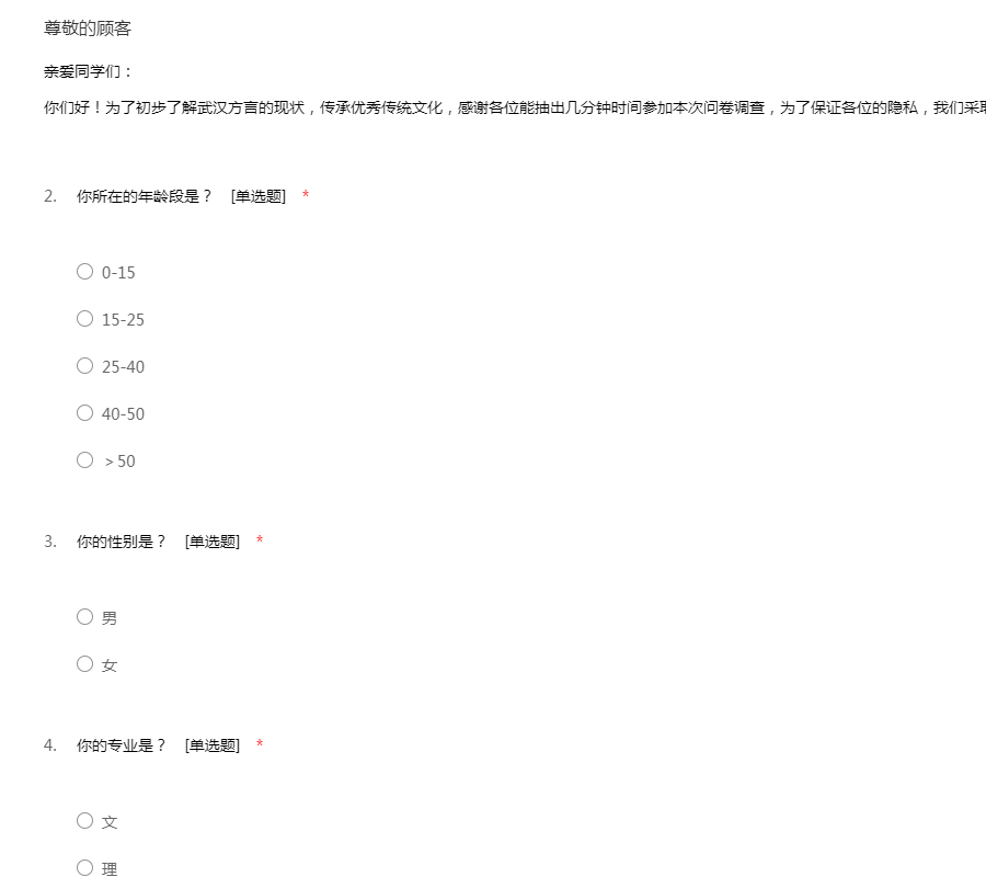 亲爱同学们:你们好!为了初步了解武汉方言的现状,传承优秀传统文化,感谢各位能抽出几分钟时间参加本次问卷调查,为了保证各位的隐私,我们采取无记名调查,感谢你们的参与!谢谢!