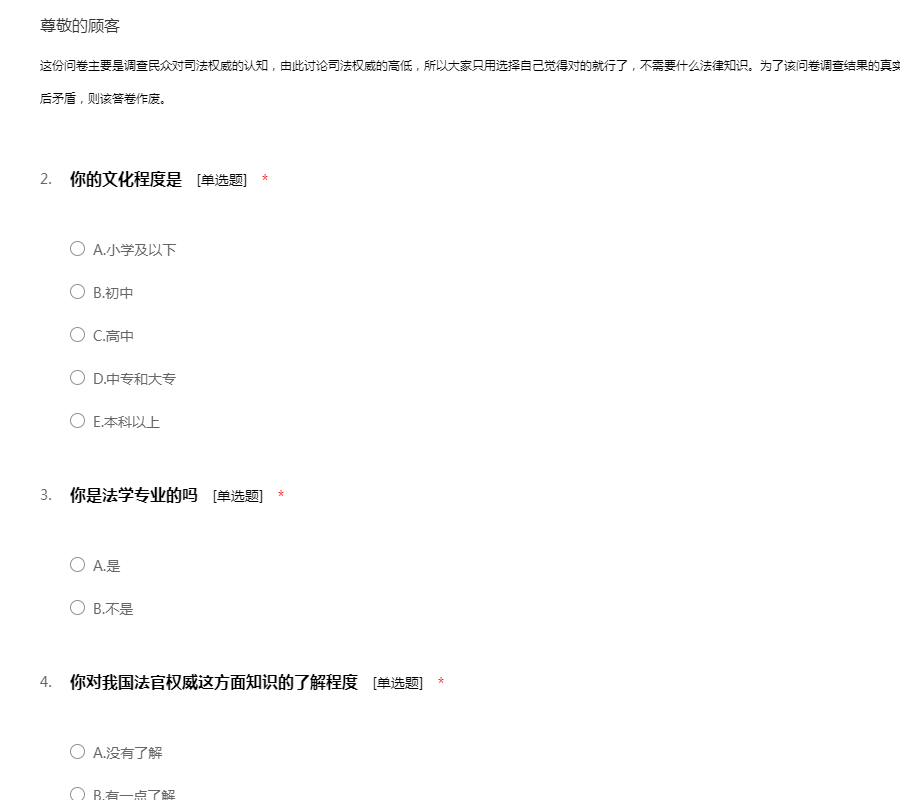这份问卷主要是调查民众对司法权威的认知,由此讨论司法权威的高低,所以大家只用选择自己觉得对的就行了,不需要什么法律知识。为了该问卷调查结果的真实性,请大家认真答题,有部分问题重复,如果前后矛盾,则该答卷作废。