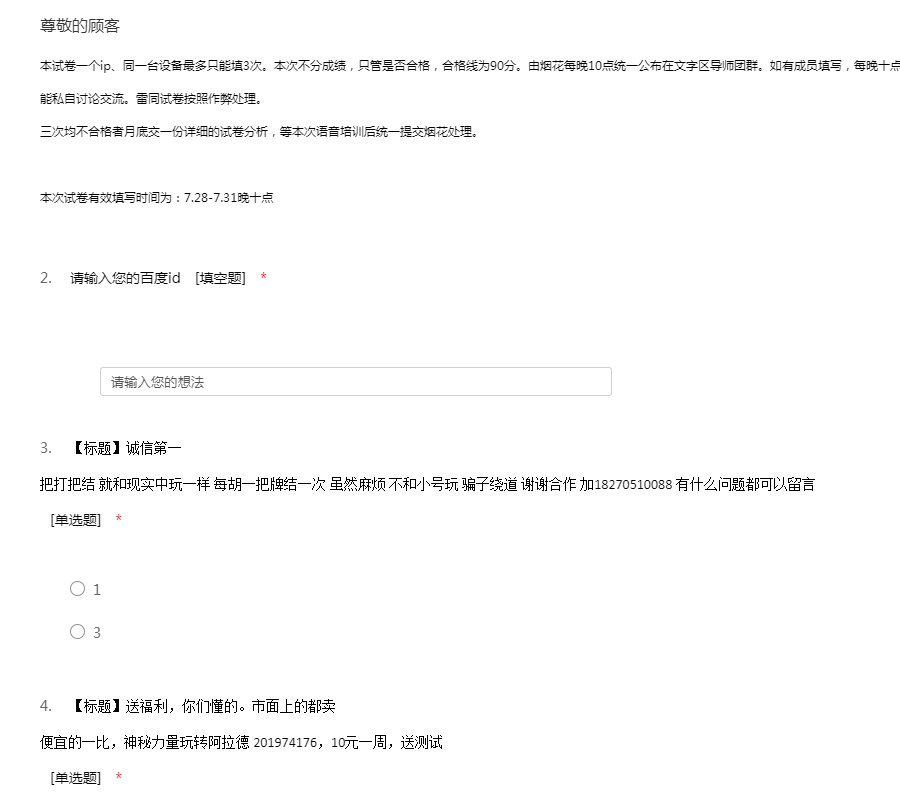 本试卷一个ip、同一台设备最多只能填3次。本次不分成绩,只管是否合格,合格线为90分。由烟花每晚10点统一公布在文字区导师团群。如有成员填写,每晚十点结果公布后由部长、副部、导师等转为查看。不能私自讨论交流。雷同试卷按照作弊处理。三次均不合格者月底交一份详细的试卷分析,等本次语音培训后统一提交烟花处理。本次试卷有效填写时间为:7.28-7.31晚十点