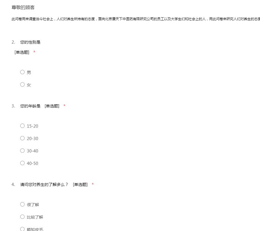 此问卷用来调查当今社会上,人们对养生所持有的态度,面向北京康天下中医药有限研究公司的员工以及大学生们和社会上的人,用此问卷来研究人们对养生的态度以及平时大家对身体的注重程度
