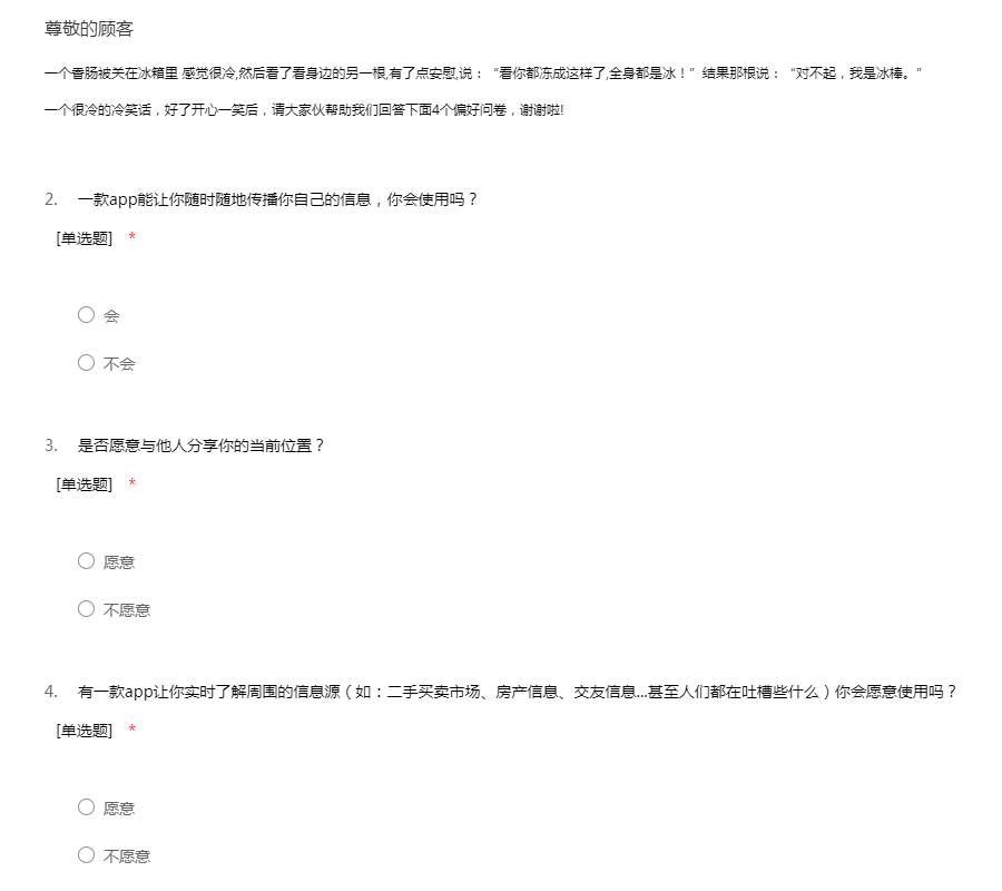 一个香肠被关在冰箱里 感觉很冷,然后看了看身边的另一根,有了点安慰,说:“看你都冻成这样了,全身都是冰!”结果那根说:“对不起,我是冰棒。”一个很冷的冷笑话,好了开心一笑后,请大家伙帮助我们回答下面4个偏好问卷,谢谢啦!