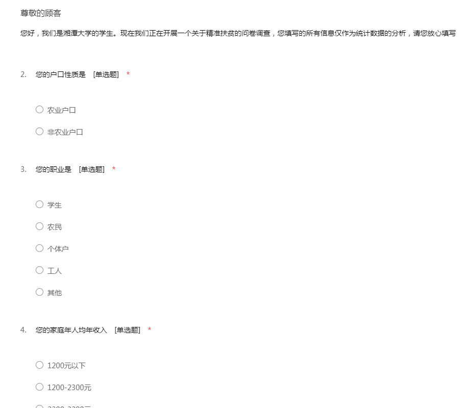 您好,我们是湘潭大学的学生。现在我们正在开展一个关于精准扶贫的问卷调查,您填写的所有信息仅作为统计数据的分析,请您放心填写!谢谢您的支持!