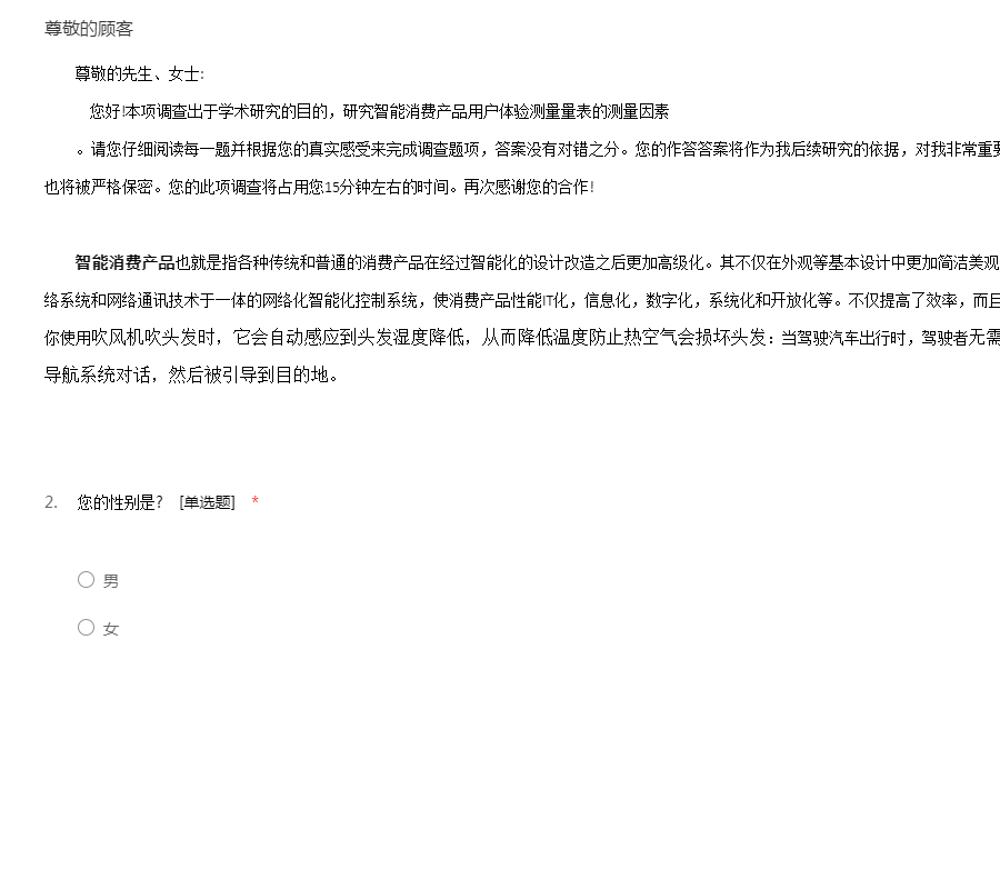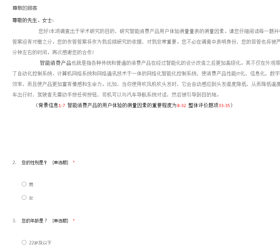 尊敬的先生、女士: 您好!本项调查出于学术研究的目的,研究智能消费产品用户体验测量量表的测量因素。请您仔细阅读每一题并根据您的真实感受来完成调查题项,答案没有对错之分。您的作答答案将作为我后续研究的依据,对我非常重要。您不必在调查中表明身份,您的回答也将被严格保密。您的此项调查将占用您15分钟左右的时间。再次感谢您的合作!