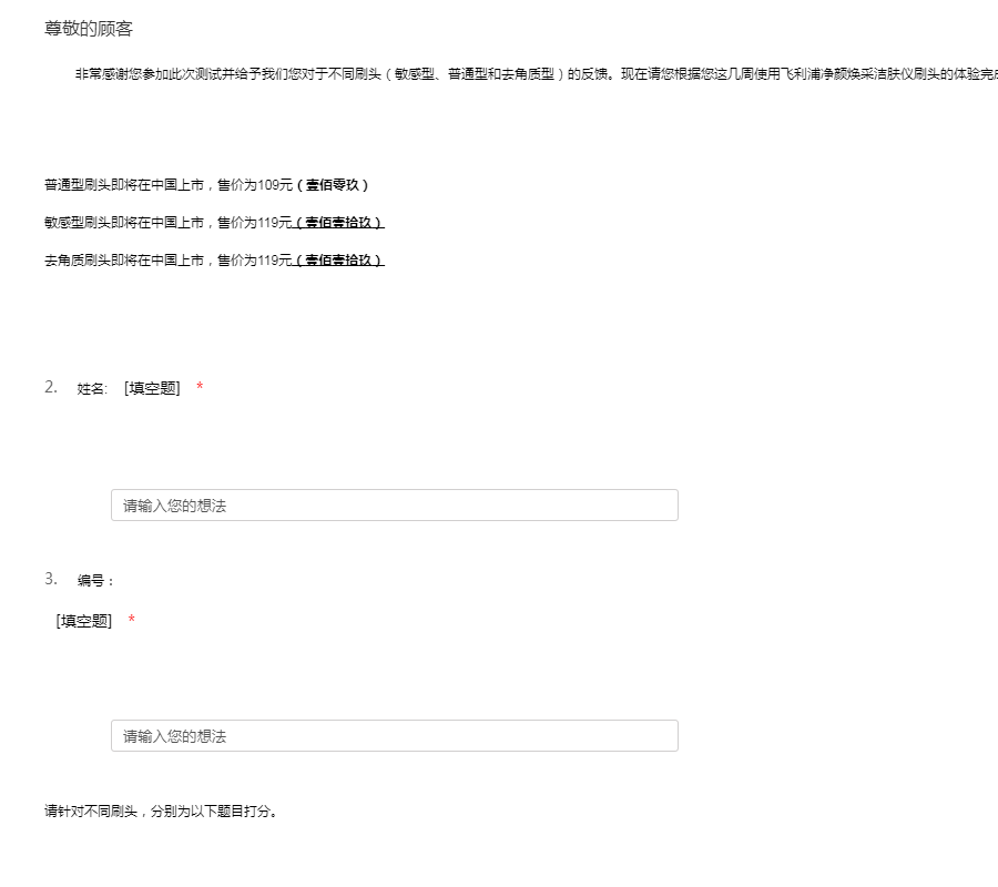 非常感谢您参加此次测试并给予我们您对于不同刷头(敏感型、普通型和去角质型)的反馈。现在请您根据您这几周使用飞利浦净颜焕采洁肤仪刷头的体验完成以下问卷。 普通型刷头即将在中国上市,售价为109元(壹佰零玖) 敏感型刷头即将在中国上市,售价为119元(壹佰壹拾玖) 去角质刷头即将在中国上市,售价为119元(壹佰壹拾玖)