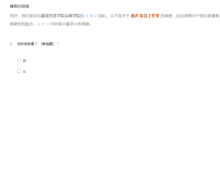 您好,我们是来自湖北经济学院法商学院的 A to Z 团队。以下是关于 原声 影音工作室 的调查,这份调查对于我们很重要。请您耐心看完题目,并认真填写。谢谢您的配合,A to Z 对你表示最衷心的感谢。