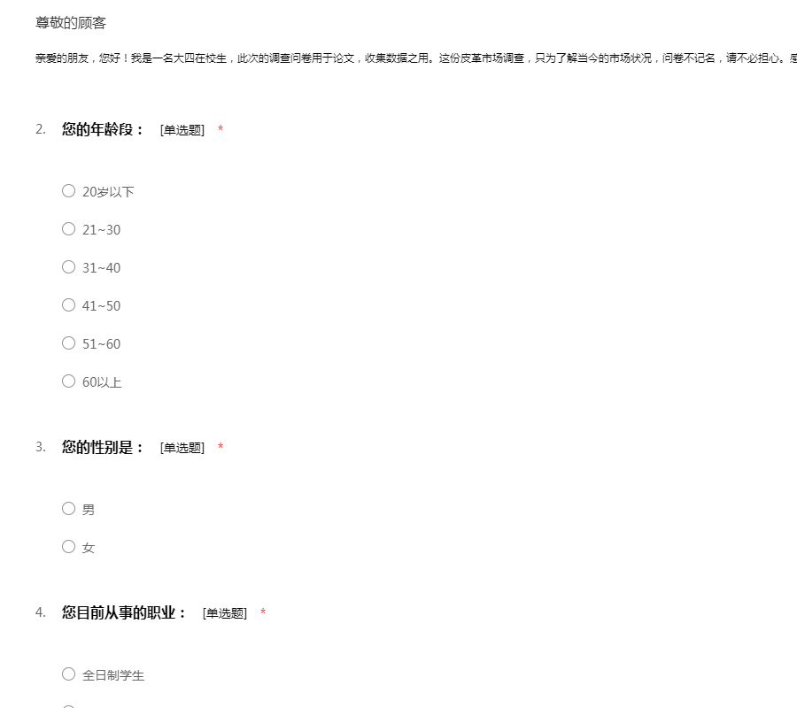 亲爱的朋友,您好!我是一名大四在校生,此次的调查问卷用于论文,收集数据之用。这份皮革市场调查,只为了解当今的市场状况,问卷不记名,请不必担心。感谢您对帮助与支持!