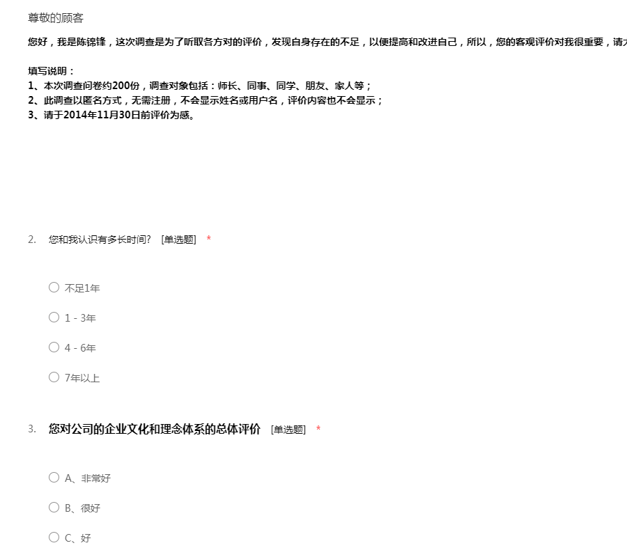 您好,我是陈锦锋,这次调查是为了听取各方对的评价,发现自身存在的不足,以便提高和改进自己,所以,您的客观评价对我很重要,请大胆填写哦,非常感谢您的帮助! 填写说明: 1、本次调查问卷约200份,调查对象包括:师长、同事、同学、朋友、家人等; 2、此调查以匿名方式,无需注册,不会显示姓名或用户名,评价内容也不会显示; 3、请于2014年11月30日前评价为感。