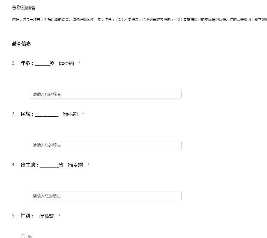 你好,这是一项关于手指比率的调查。请你仔细阅读问卷,注意:(1)不要遗漏,也不必费时去考虑;(2)要根据自己的实际情况回答。你的回答仅用于科学研究,我们会替你保密,请放心作答。