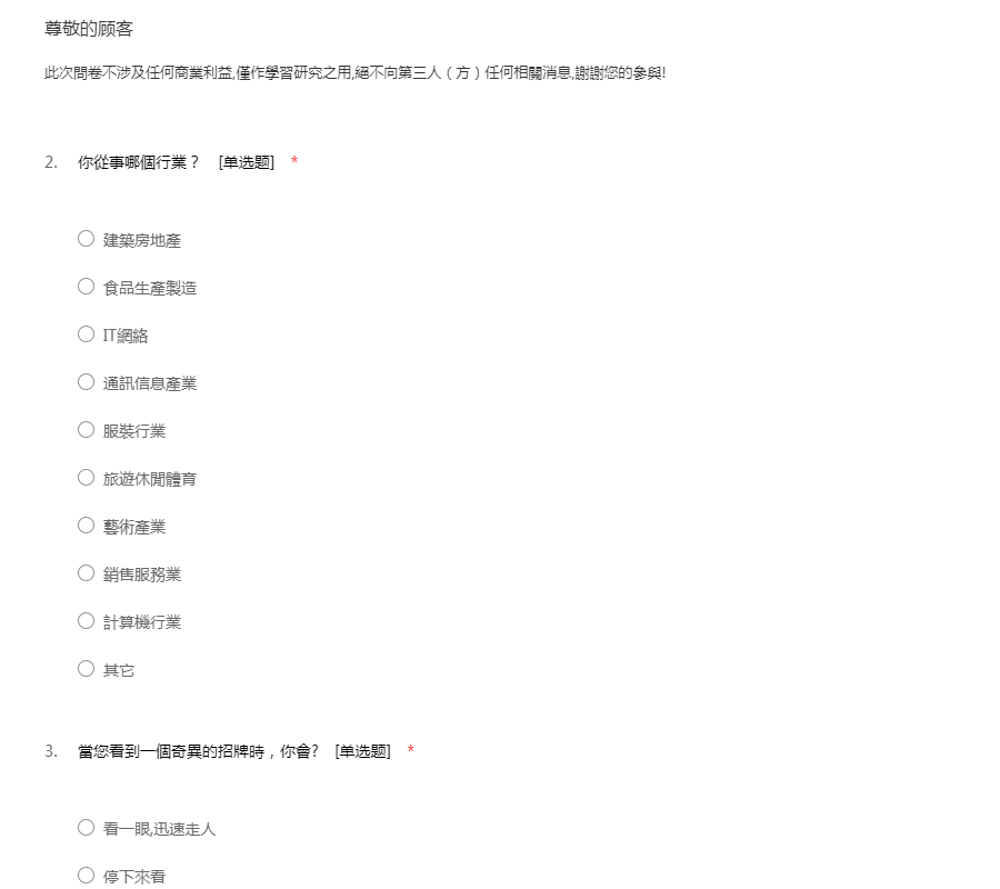 此次問卷不涉及任何商業利益,僅作學習研究之用,絕不向第三人(方)任何相關消息,謝謝您的參與!