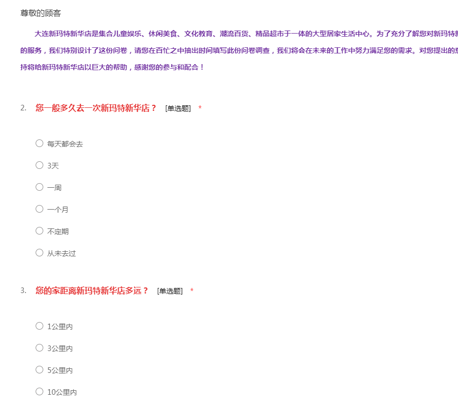 大连新玛特新华店是集合儿童娱乐、休闲美食、文化教育、潮流百货、精品超市于一体的大型居家生活中心。为了充分了解您对新玛特新华店的需求,为了我们能提供更加优质的服务,我们特别设计了这份问卷,请您在百忙之中抽出时间填写此份问卷调查,我们将会在未来的工作中努力满足您的需求。对您提出的意见我们会及时改进,相信您的关注和支持将给新玛特新华店以巨大的帮助,感谢您的参与和配合!