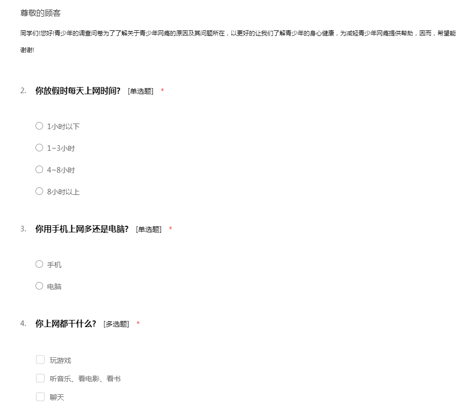 同学们!您好!青少年的调查问卷为了了解关于青少年网瘾的原因及其问题所在,以更好的让我们了解青少年的身心健康,为减轻青少年网瘾提供帮助,因而,希望能认真的花些时间完成这份青少年的网瘾调查问卷!谢谢!