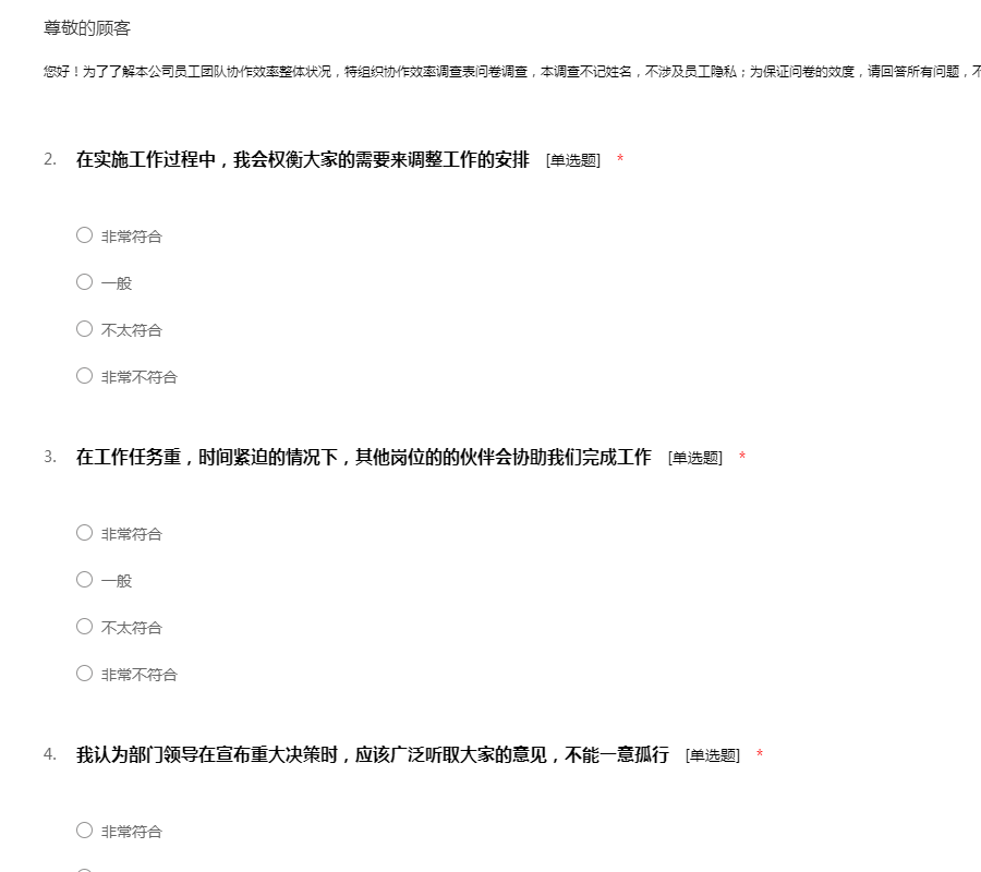 您好!为了了解本公司员工团队协作效率整体状况,特组织协作效率调查表问卷调查,本调查不记姓名,不涉及员工隐私;为保证问卷的效度,请回答所有问题,不要遗漏;真诚的希望得到您的
