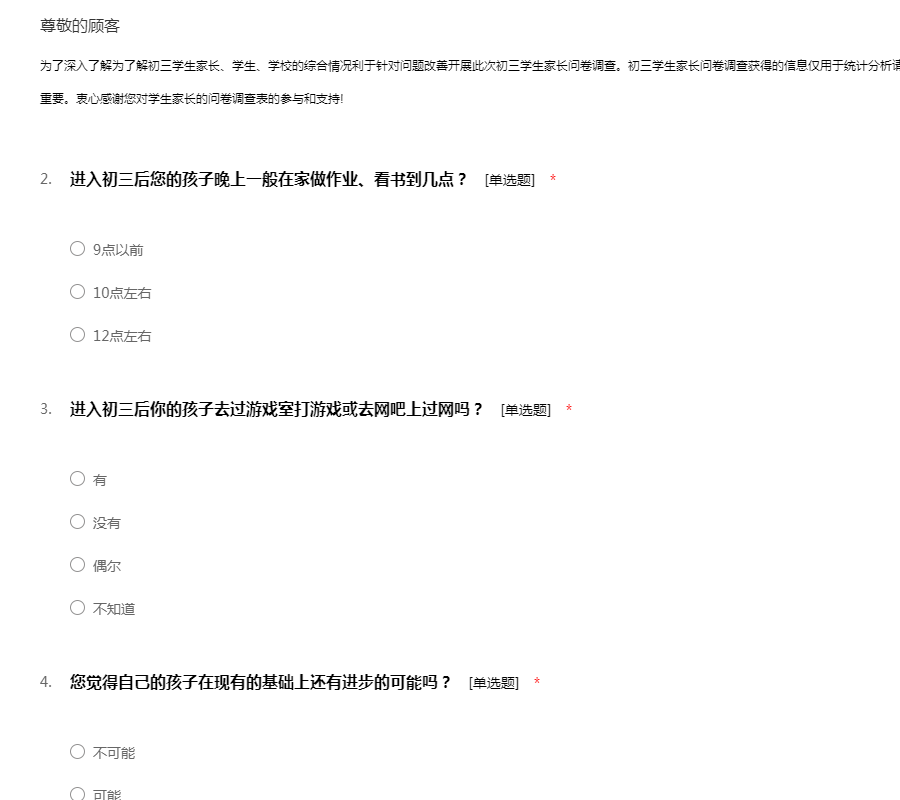 为了深入了解为了解初三学生家长、学生、学校的综合情况利于针对问题改善开展此次初三学生家长问卷调查。初三学生家长问卷调查获得的信息仅用于统计分析请根据实际情况填写您的真实回答对我们的研究很重要。衷心感谢您对学生家长的问卷调查表的参与和支持!