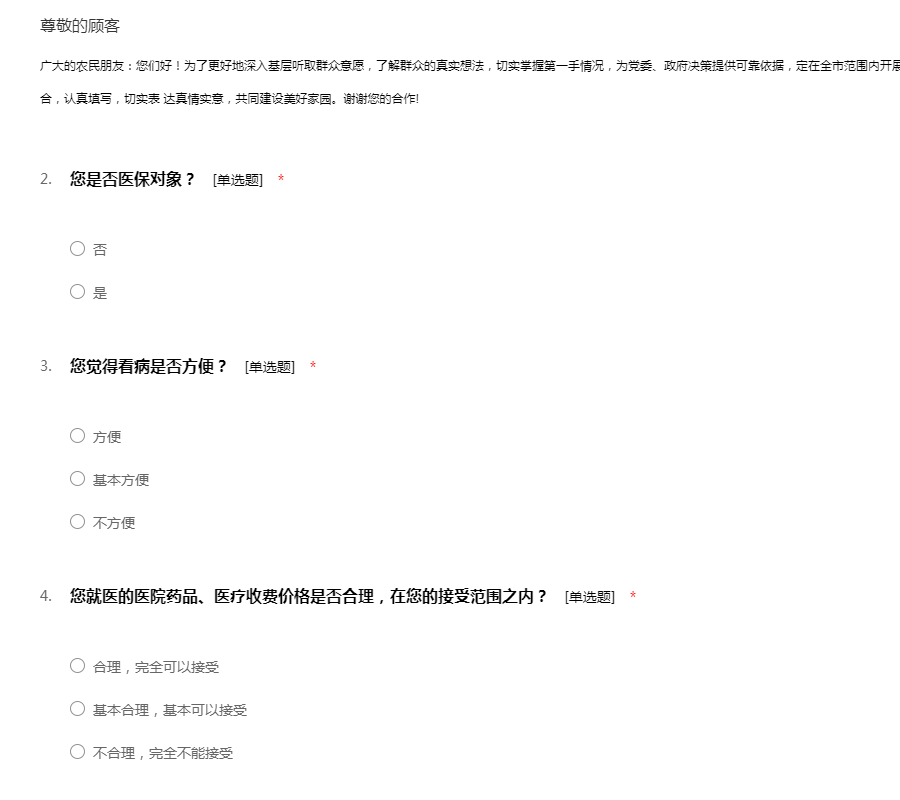 广大的农民朋友:您们好!为了更好地深入基层听取群众意愿,了解群众的真实想法,切实掌握第一手情况,为党委、政府决策提供可靠依据,定在全市范围内开展基层组织年调查问卷,希望广大农民朋友积极配合,认真填写,切实表 达真情实意,共同建设美好家园。谢谢您的合作!