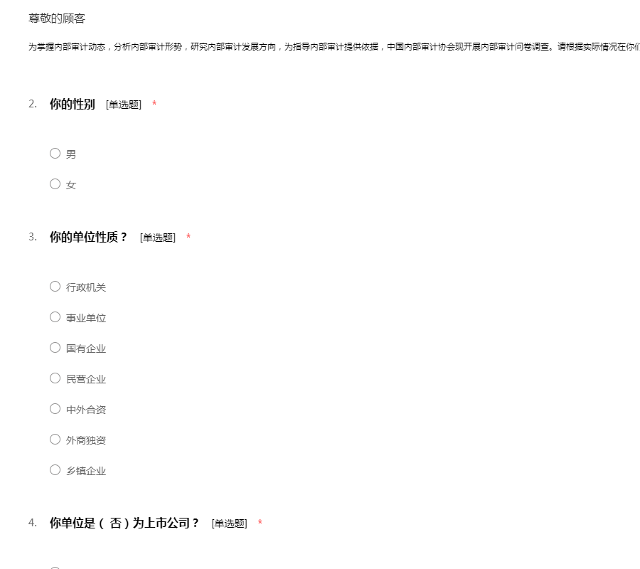为掌握内部审计动态,分析内部审计形势,研究内部审计发展方向,为指导内部审计提供依据,中国内部审计协会现开展内部审计问卷调查。请根据实际情况在你们认为合适的内部审计调查问卷填上正确的答案。