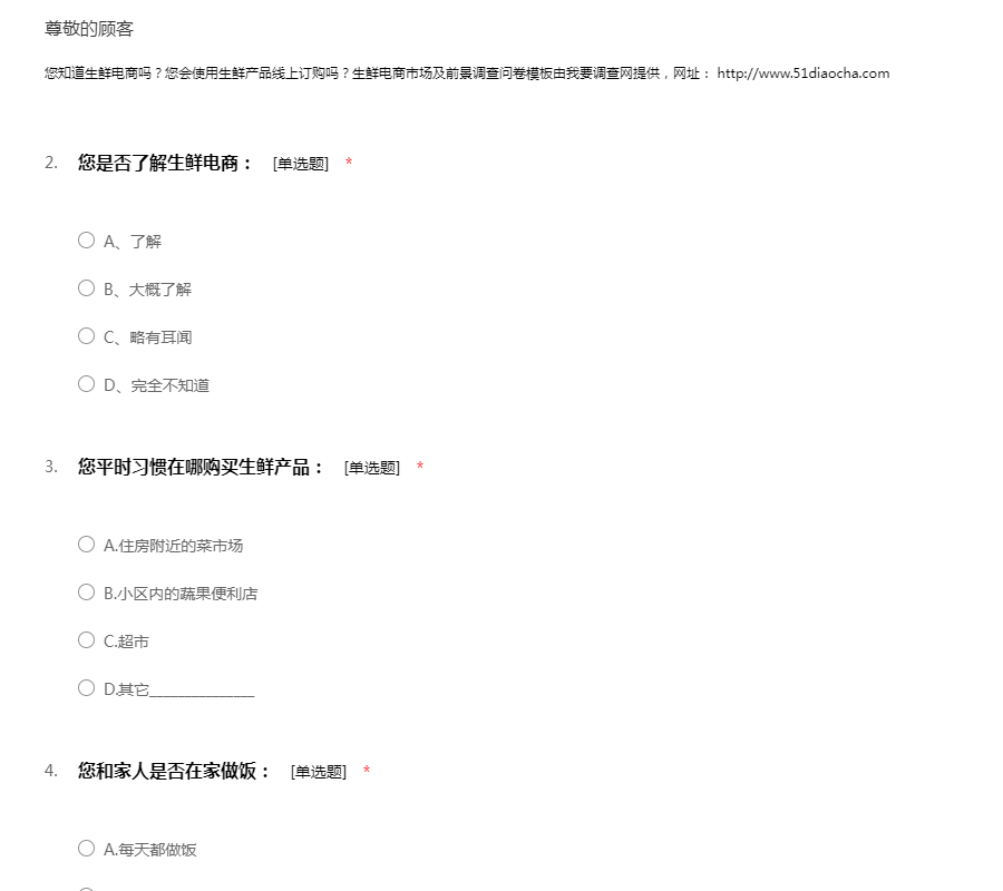 您知道生鲜电商吗?您会使用生鲜产品线上订购吗?生鲜电商市场及前景调查问卷模板由我要调查网提供,网址: http://www.51diaocha.com