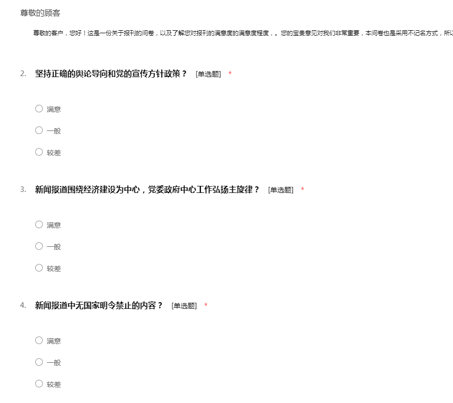 ——尊敬的客户,您好!这是一份关于报刊的问卷,以及了解您对报刊的满意度的满意度程度,。您的宝贵意见对我们非常重要,本问卷也是采用不记名方式,所以请放心的如实填写。感谢您的支持与配合!